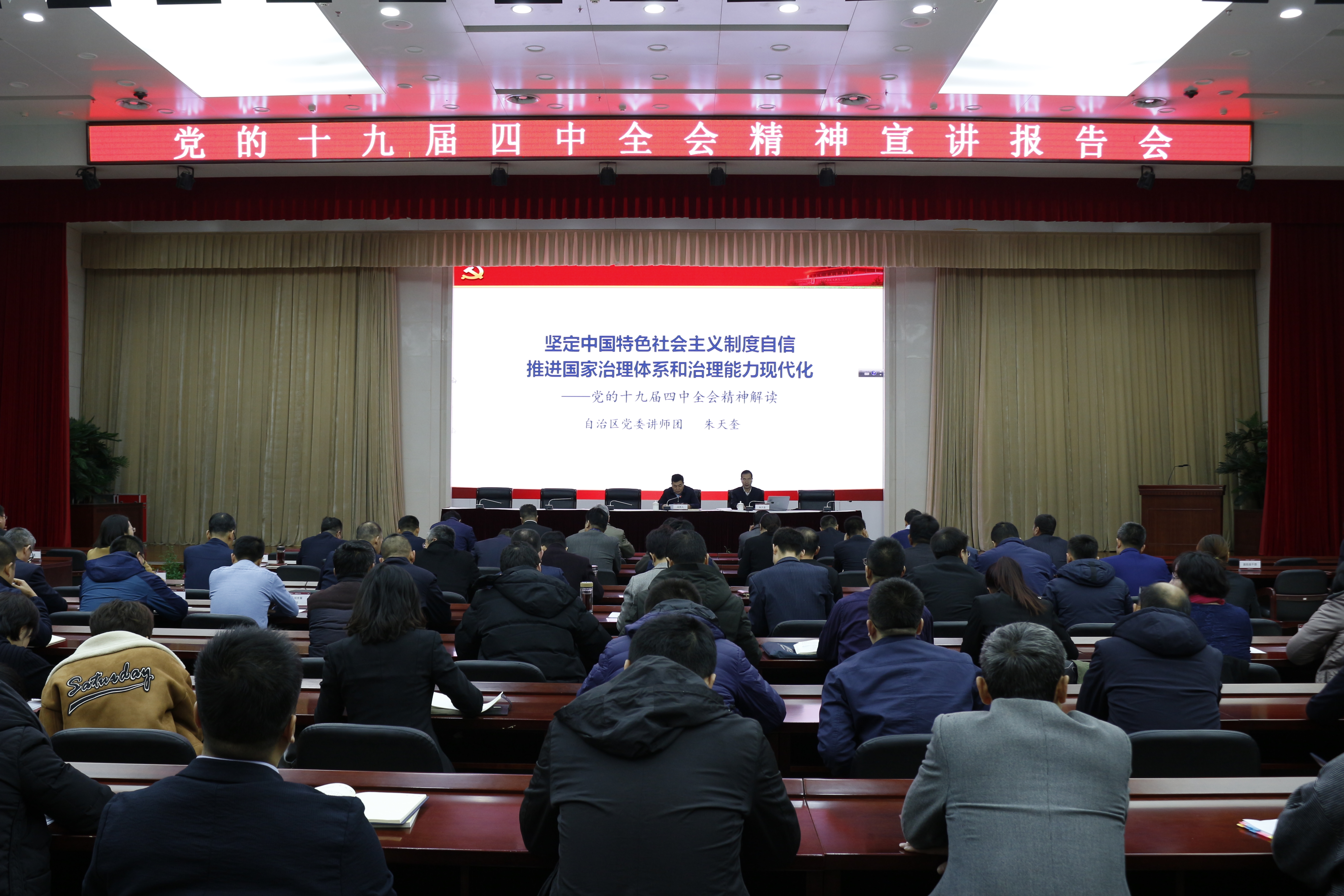 自治区党委讲师团团长、教授朱天奎从全会的4个重大意义、中国特色社会主义制度及其13个显著优势、《决定》提出的总体要求、总体目标和13项重点任务、加强党的领导需要抓好的3件事等方面做了全面解读,既方便记忆,又容易理解。