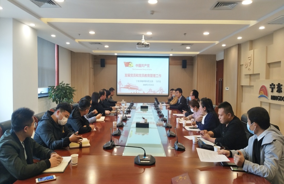 为了做好2020年发展党员工作,优化党员队伍结构,不断增强党组织的创造力、战斗力和凝聚力。2020年3月31日,环保局党支部开展了《发展党员和党员教育管理》党课教育,由环保局党支部宣传委员马伏龙同志主讲。环保局、监测站全体党员和非党员参加了党课,还邀请了党建共建单位宁夏中旭基业环保科技有限公司、宁夏新丰益节能科技有限公司、宁夏金美生物科技有限公司的党建负责人,党务工作者及部分党员共同学习。