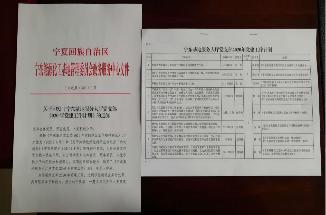 为了深入贯彻落实《关于印发<宁东基地党工委2020年党的建设工作安排意见>的通知》(宁东党发〔2020〕6号)和《关于持续做好党建示范推进点工作的通知》(宁东党建办〔2019〕1号)文件精神,宁东基地服务大厅党支部紧紧围绕业务工作和服务大局,一是制定了《宁东基地服务大厅党支部2020年党建工作计划》,将2020年党建工作计划细化为58条,并正式印发各部门,责任明确,分工到人,让11名党员、预备党员、入党积极分子参与到党建工作中,激发党员创新活力,将党建工作做精做细做实;二是将党风廉政、精神文明、平安宁东建设、法制、安全生产、保密等工作一并融入到党建工作中,同安排、同要求、同落实,避免“两张皮”“空对空”和推诿扯皮现象;三是根据党建年度工作计划,细化月度工作任务,以党建工作指导业务工作,着力在实效上下功夫,避免空对空,务求实打实,引导党员立足岗位,担当责任,带头服务群众,发挥先锋模范作用。