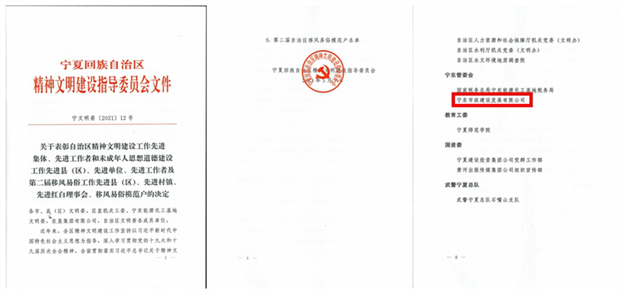 2022年1月10日,自治区精神文明建设工作表彰大会在银川召开,授予宁夏宁东市政建设发展有限公司“自治区精神文明建设工作先进集体”荣誉称号。