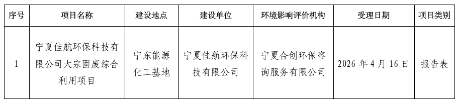 根据建设项目环境影响评价审批程序的有关规定,2026年4月16日我局受理1个建设项目环境影响评价文件。现将受理情况予以公示,公示期为2026年4月16日-2026年4月22日(5个工作日)。