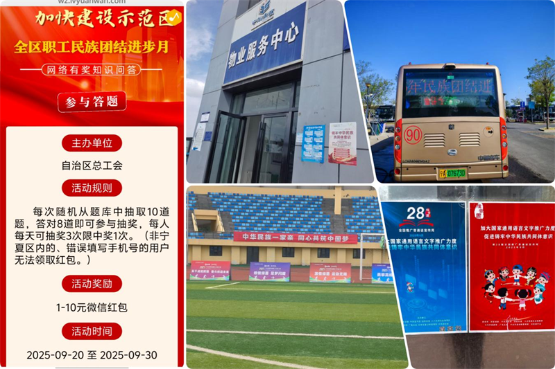 活动期间,公司党总支及各所属党支部积极行动,聚焦铸牢中华民族共同体意识主线,围绕“牢记嘱托担使命 加快建设示范区”主题,深入开展专题学习研讨、红色观影、讲专题党课、帮扶慰问等民族团结进步月系列活动,有效促进各民族交往交流交融,巩固民族团结、社会和谐的良好局面。一是持续深化理论武装。公司党总支及各所属党支部依托理论学习中心组、“三会一课”、主题党日等形式,深学细悟笃行习近平总书记关于铸牢中华民族共同体意识的重要论述及加强和改进民族工作的重要思想等内容,开展铸牢中华民族共同体意识专题研讨,组织党员干部职工积极参与全区职工民族团结进步月网络有奖知识答题活动,让党的民族理论政策教育深入人心,切实筑牢“四个与共”“五个认同”的思想根基。二是深入开展调查研究。党总支班子成员以身作则、率先垂范,深入园区企业、工程建设及物业服务项目等基层一线进行调研,围绕如何将民族团结理念融入日常工作、园林绿化、物业服务、公共管廊运维等具体工作中,深入调查研究,让党员干部职工和各族员工在体悟中认同、在认同后笃行,持续推动铸牢中华民族共同体意识在各业务领域落地生根。三是开展红色观影活动。组织党员干部职工群众集中观看了纪念中国人民抗日战争暨世界反法西斯战争胜利80周年大会实况直播和红色电影《南京照相馆》《731》,以沉浸式观影方式开展爱国主义教育,深刻感受抗战精神的磅礴力量,赓续红色血脉、厚植家国情怀,从历史深处汲取砥砺奋进的精神力量。四是开展讲专题党课。各所属党支部围绕“铸牢中华民族共同体意识”主题,开展讲专题党课活动,深入解读了铸牢中华民族共同体意识的理论内涵、重要意义和核心要义,教育引导党员职工群众牢固树立正确的中华民族历史观,坚定不移将铸牢中华民族共同体意识工作主线贯穿公司工作的全过程、各环节。五是不断拓宽宣传渠道。全面巩固深化全区民族团结进步示范单位创建成果,常态化开展铸牢中华民族共同体意识宣传教育,充分利用公交车和公交站电子屏、公司电梯电子屏等载体,滚动播放“小宁大讲堂”关于铸牢中华民族共同体意识的宣传片,在各物业服务项目的醒目位置,通过张贴宣传海报、横幅、图片等内容,大力宣传民族团结政策相关知识,切实推动铸牢中华民族共同体意识融入日常、走深走实。六是践行国企社会责任。主动参与固原市三营镇金轮村、西吉县兴隆镇马堡村困难群众的帮扶慰问工作,为低保残疾群众送去温暖,以实际行动巩固拓展脱贫攻坚成果,促进各民族交往交流交融,助力乡村全面振兴。主动与结对共建社区共同开展“微心愿”认领活动,用一个个微小却饱含真情的行动,汇聚成大爱暖流,共同绘就各民族幸福生活新图景。七是积极参与结对共建活动。积极参与灵新社区开展的“情暖中秋、共筑同心”铸牢中华民族共同体意识主题活动,通过与社区各族群众一起共享美食,共同开展趣味游戏、DIY手工编织等活动,进一步增进了与社区各族群众之间的情感交流与文化融合,着力营造了团结友爱、互促共融的良好氛围。