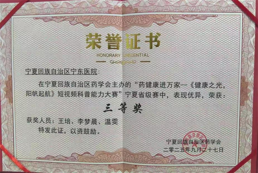 近日,宁夏“药健康进万家”短视频科普大赛举行。宁东医院药械科临床药师团队凭借扎实的专业功底与创新的科普形式,《吃药,也要“踩对点”》作品荣获大赛三等奖,展现了基层医疗机构在健康科普领域的创新活力。