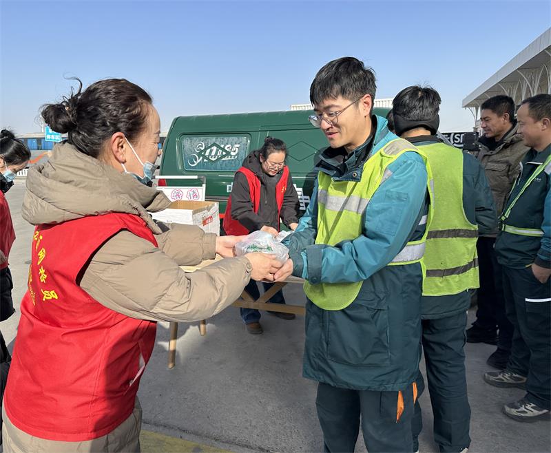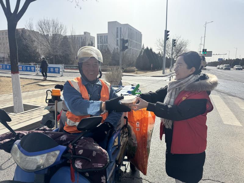 ——图为中心区社区工作者为环卫工人送上暖心腊八粥及节日祝福